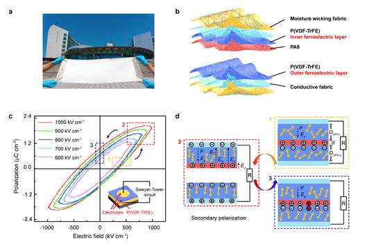 (a)和(b)电子织物材料的实物和结构示意图;(c)P(VDF-TrFE)纳米纤维铁电体的电滞回线;(d)摩擦/铁电协同模型示意图