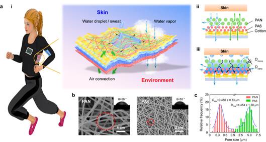 (a)电子织物材料的透气、透湿及吸湿排汗功能示意图;(b)和(c)亲水纤维的多级网络结构及直径分布