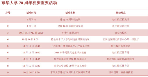 1951——2021,大江奔流,弹指七秩,春华秋实,弦歌不辍。一代代东华人与时代同行,与国运相系,弘扬践行“崇德博学、砺志尚实”的校训精神,为建设“国内一流、国际有影响,有特色的高水平研究型大学”砥砺前行。