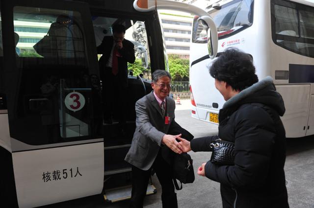 3月16日下午,我校全国人大代表、管理学院严诚忠教授在参加完十二届全国人大四次会议全部议程后,随上海代表团乘班机返回上海。校统战部部长王英等前往上海展览中心迎接严诚忠教授,并与严教授亲切交流今年的参会感受。