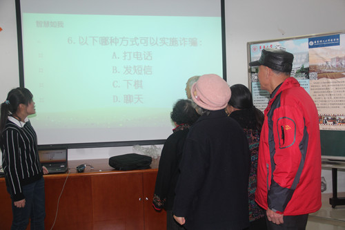 当前中国社会已步入老龄化,特别是作为国际大都市的上海,人口老龄化问题更为严重,随着老年人口的不断增加,一些不法分子将行骗目标对准了这个庞大的群体,骗术多种多样,防不胜防。管理学院分团委书记丁伟谈到,管理学院科学商店本着服务社区、便民利民、回馈社会的宗旨,举办中老年防诈骗科普志愿服务工作,既着眼于引导学生学以致用,又致力普及中老年防诈骗知识,努力在高校与社区之间形成“双赢”互动。