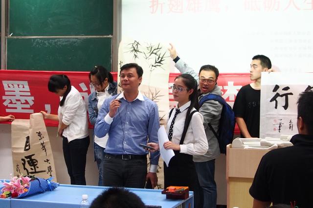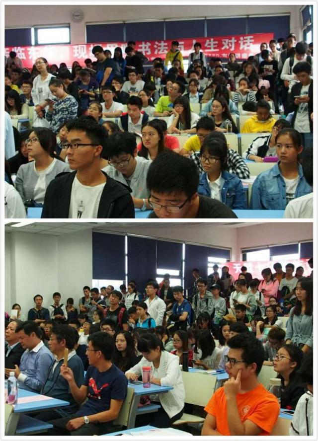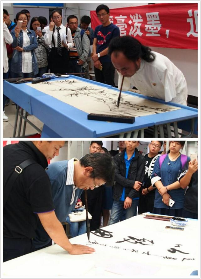 讲座现场,陈伟强先生上台与大家分享了自己从一位无臂少年成长为一名无臂青年书画家的人生故事,目前他更积极的从事公益慈善、助残扶残事业。他勉励大学生要敢于学、敢于练、敢于拼、敢于攀登。之后,和志刚先生也上台用自己精彩的人生经历鼓励同学,面对人生的不如意,勇敢应对,积极挑战,依旧可以收获璀璨人生。随后,两位嘉宾现场泼墨,收获现场观众一致惊叹。
