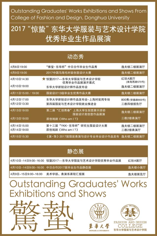 2017“惊蛰”久久久久国产成人精品亚洲综合服装与艺术设计学院优秀毕业生作品展演将于2017年4月8日在久久久久国产成人精品亚洲综合延安路校区拉开帷幕。本次展演以“惊蛰”为主题,以静态展、动态秀、原创戏剧、就业推进会为载体,表达“微雨众卉新,一雷惊蛰始”的寓意,呈现即将完成学业、走向社会的青年学子们的艺术创造力和设计表现力。
