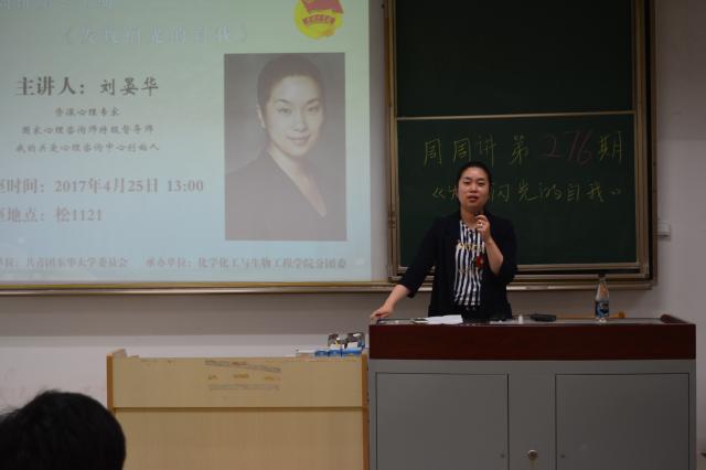 4月25日,美国心理协会精神分析师、资深心理专家刘晏华女士走进“周周讲”校园讲坛,为东华学子带来一场题为“发现闪光的自我”的讲座,对学生的成长规律进行解读与剖析,帮助学生进行更加深入的自我认知,为学生今后的成长成才指明方向。