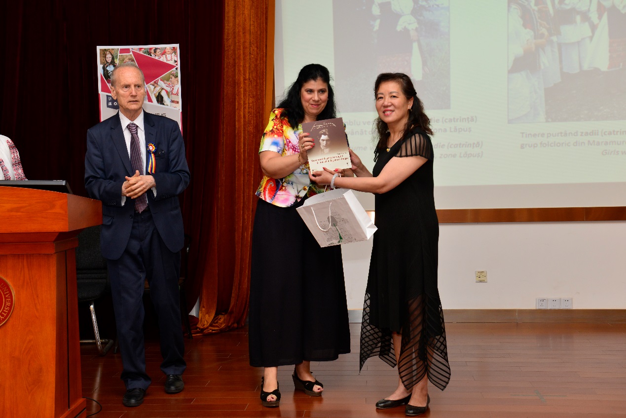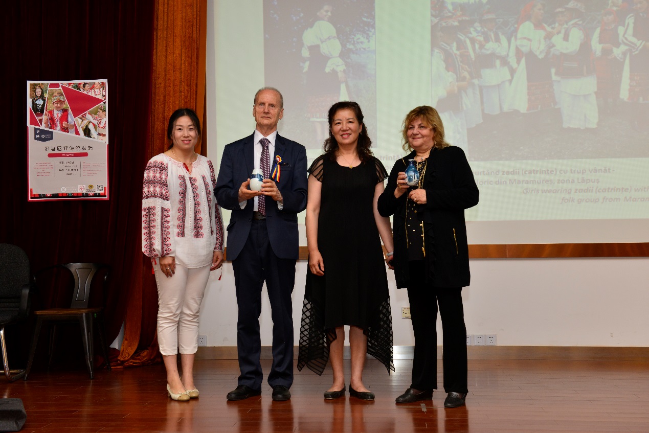(罗马尼亚文化学院总局长Dragan Ioana女士(中)向学院赠送罗马尼亚文化礼品)