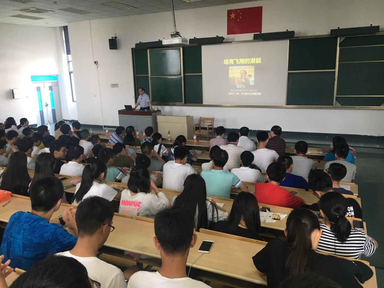 9月18日,理学院院长、中科院院士褚君浩在松江校区为理学院全体新生带来题为《培育飞翔的潜能》的入学教育讲座。学院领导和相关老师聆听了讲座。