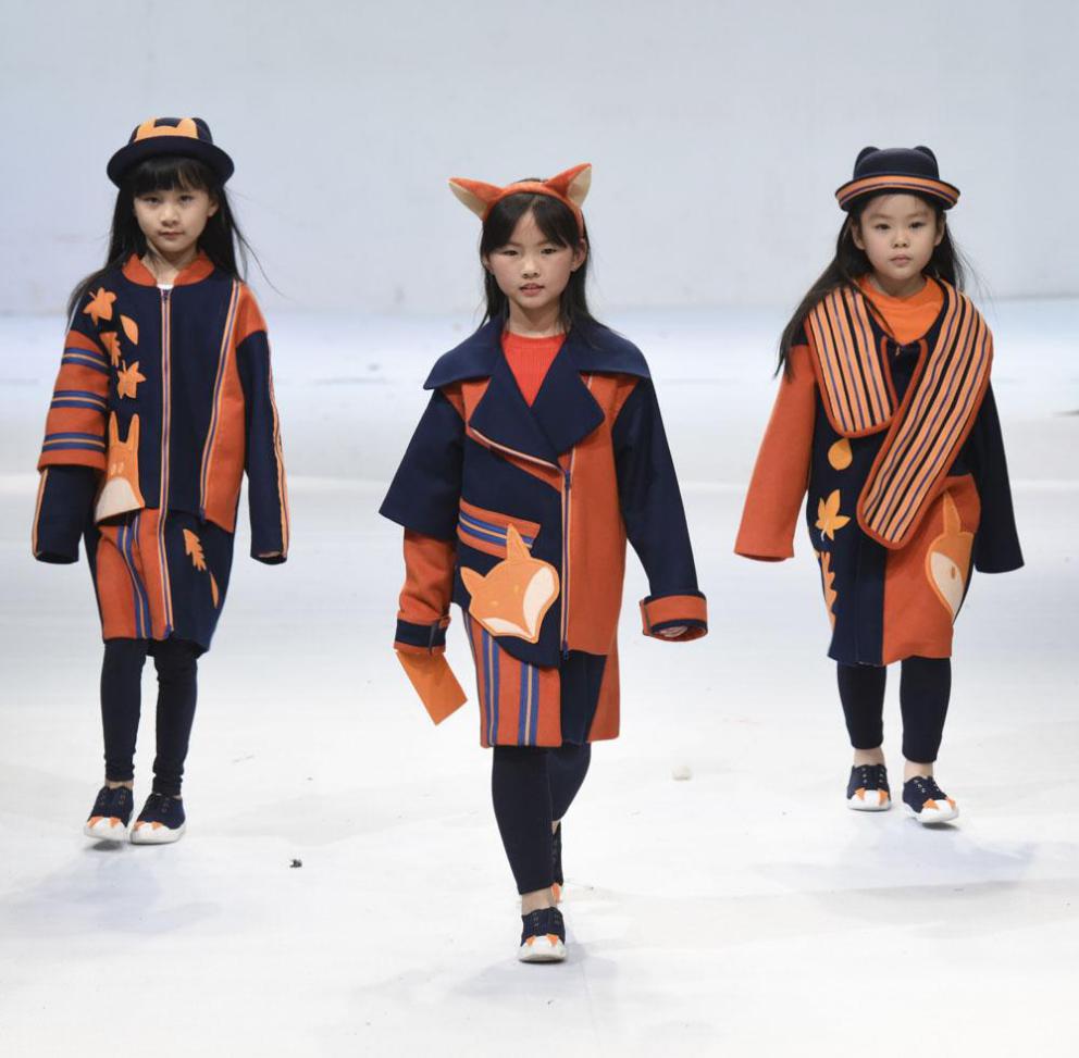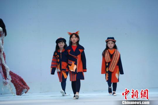 图为小模特们在展示作品