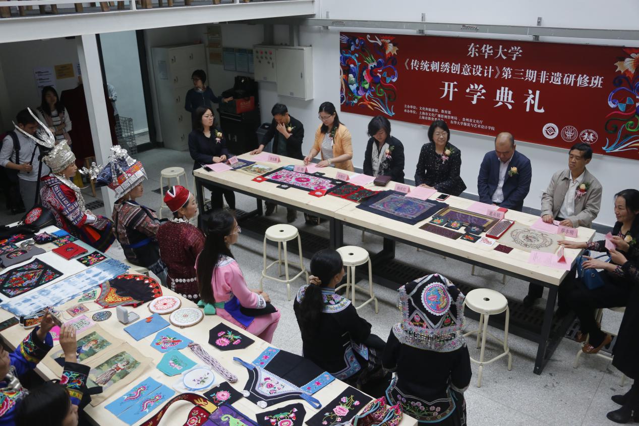 我校服装与艺术设计学院党委书记袁孟红,文化和旅游部非物质文化遗产司管理处副调研员岳青,上海文化广播影视管理局公共管理处(非遗处)处长杨庆红、副处长葛永铭,贵州省文化厅非遗处副处长李安鹏,上海社会科学院民俗与非遗研究中心常务副主任、上海民间文艺家协会副主席蔡丰明,上海市非遗保护中心专业业务指导钱张帆,校科研处副处长李凌燕,非物质文化遗产教育研究中心主任柯玲及全体研修班学员和教师代表参加活动。