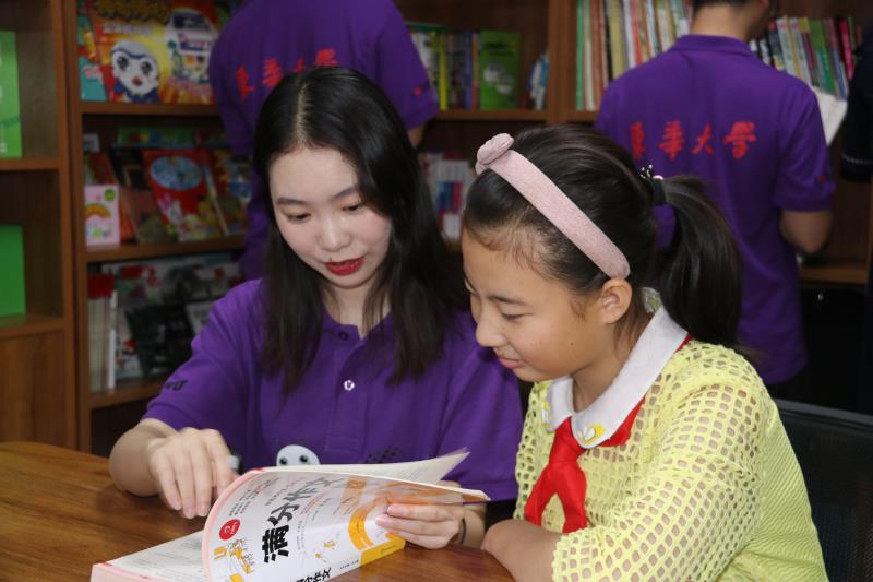 图为外语学院赴昌吉实践团成员在“光华丝路图书馆”为小学生讲解作文