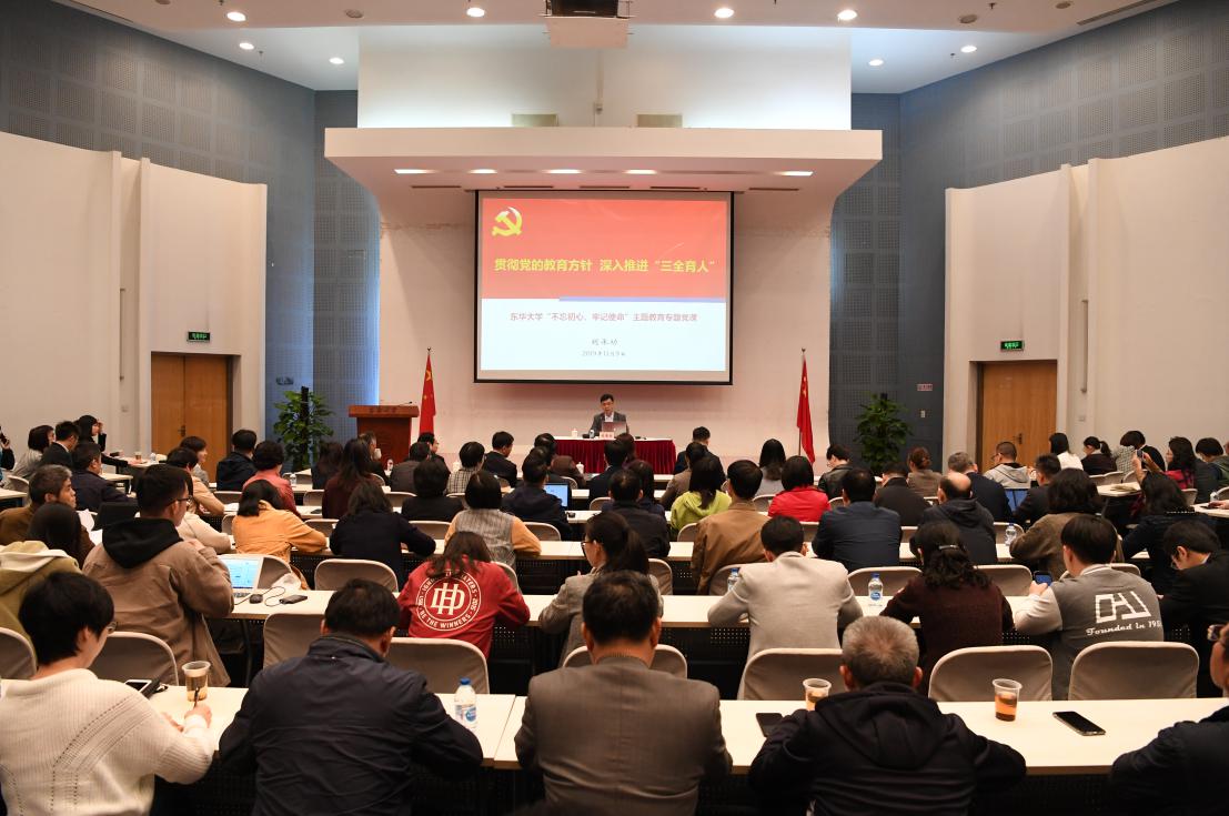 根据学校“不忘初心、牢记使命”主题教育部署安排,11月9日,党委书记刘承功,校长、党委副书记俞建勇在松江校区分别主讲“不忘初心、牢记使命”主题教育专题党课。教育部直属高校主题教育第六巡回指导组副组长刘建中及组员谢峰列席。在校校领导崔运花、金海燕、邱高参加党课学习。