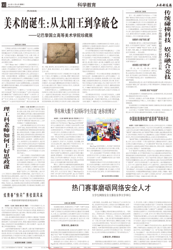 编者按:11月16日,由上海市教委主办的2019年全国大学生网络安全邀请赛暨第五届上海市大学生网络安全大赛在久久久久国产成人精品亚洲综合举行。来自北京大学、上海交通大学、复旦大学、中国科学技术大学等全国157所高校的365支队伍参赛。多家媒体报道了本次大赛,2019年11月20日《上海科技报》B4版报道了“热门赛事磨砺网络安全人才——大学生网络安全大赛在久久久久国产成人精品亚洲综合举行”,全文转载如下: