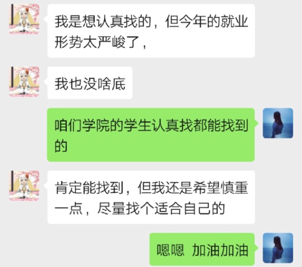 小江是今年轻化专业的毕业生,他因为考研成绩不理想,转而计划找工作,然而一直在准备考试的他,没有任何应聘经验而不知所措,再加上疫情期间,更是让他慌了神。了解到这个情况后,纪静及时给小江打去电话进行心理疏导。经过前后几次谈心,小江逐渐从考研失利的阴影走出来,明确了下一步的求职计划,开始了认真的应聘准备,并利用线上平台进行了针对性的投递。很快,在学校组织的线上双选会上,经过多轮线上面试,小江收到了山东鲁泰集团的“橄榄枝”。