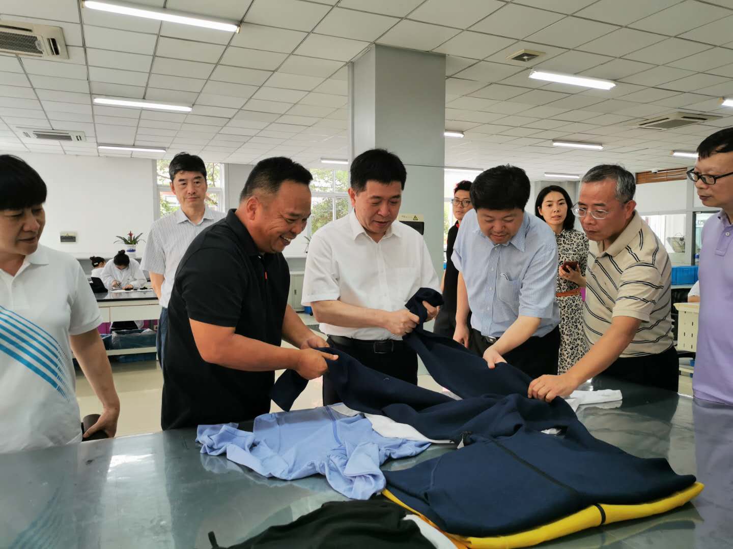 在甬期间,俞建勇一行来到申洲集团,在集团董事局主席马建荣的陪同下到集团染整车间、印花车间、实验室、现代中心等地进行了实地考察。