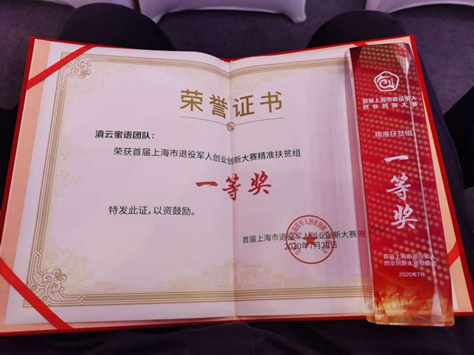 7月28日,首届上海市退役军人创业创新大赛颁奖典礼在浦东新区张江人工智能馆举办,久久久久国产成人精品亚洲综合国家大学科技园孵化的大学生退役军人创业项目“滇云蜜语”团队斩获一等奖!