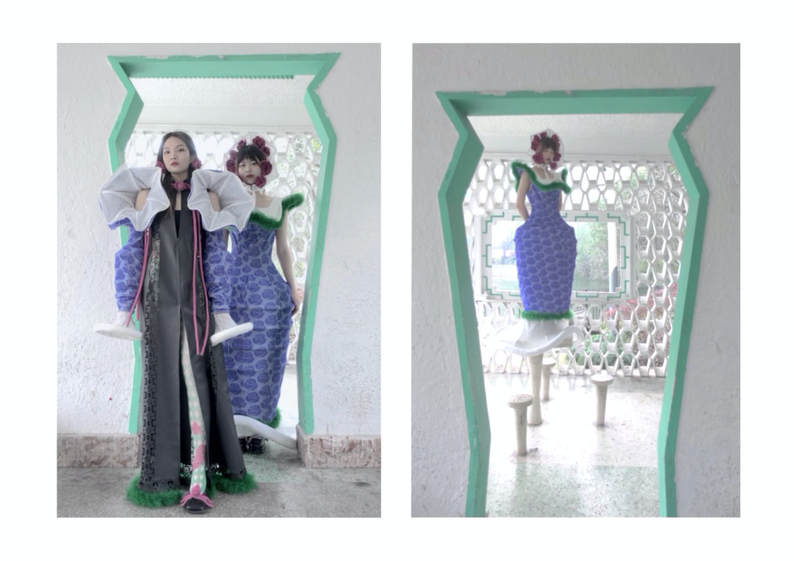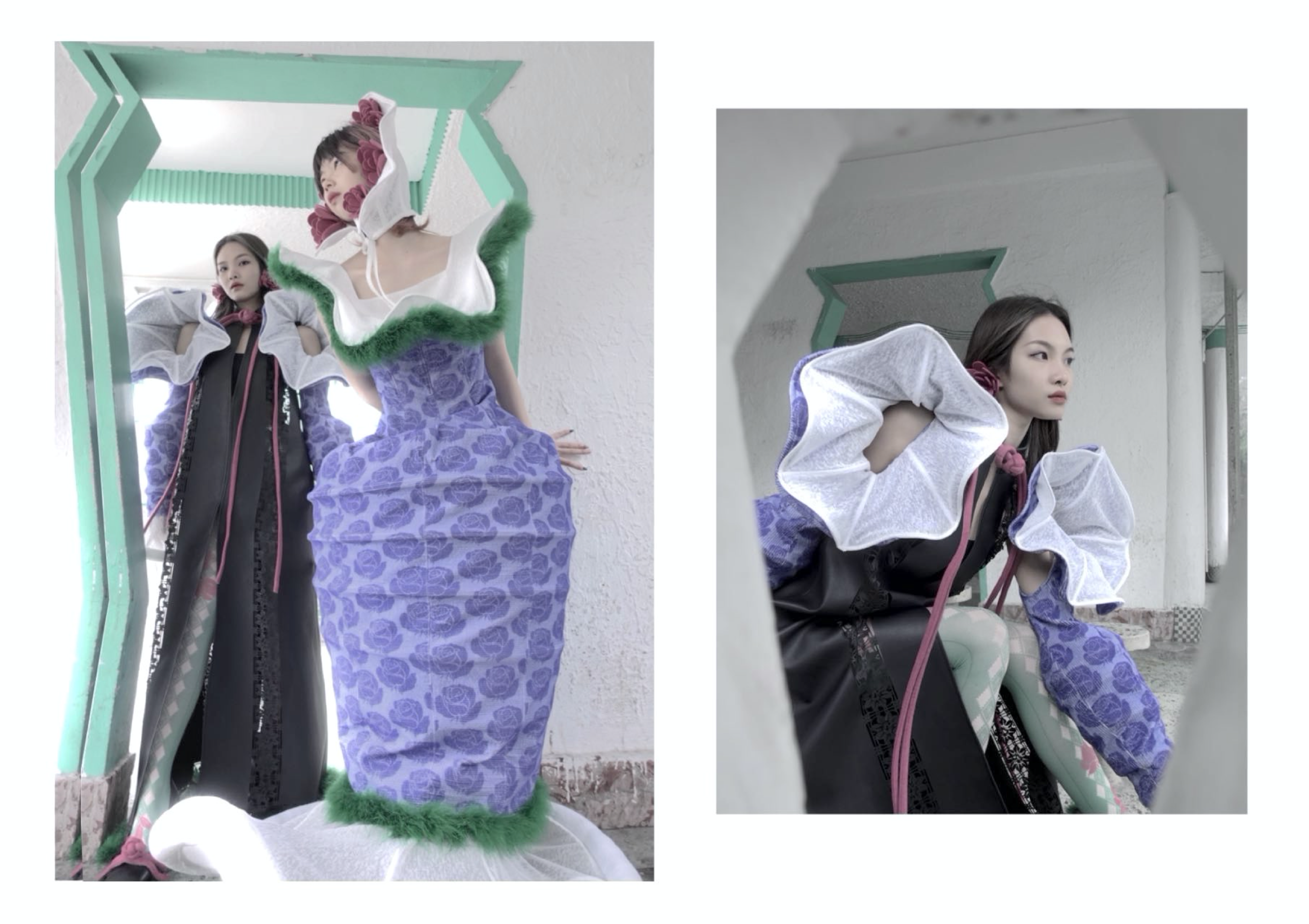 曾紫绮的作品灵感来源于中国传统文化中的纸作文化。世间每一个纸作都承载着一个不一样的故事,人们将亲情、友情、爱情等寄托在一个个精美的纸作上,是为逝去亲人、友人、爱人寄出的一封信。人们用最精美、最艳丽的纸作传递着内心深处最浓厚、最想表达的情感。服装最大的亮点在于大胆运用色彩的搭配和中式花瓶在服装造型上的变形。这个将传统文化技艺与服装的创新结合得到评委老师的好评。