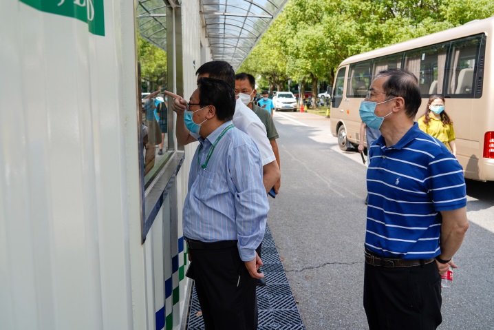 杨伟人一行先后实地走访了复合材料协同创新大楼实验室、第一食堂、教师之家(隔离场所)、PCR实验室等,实地查看学校实验室开放使用和危化品管理、人员登记情况,食堂管理和食品安全、菜品价格情况,校内隔离点设置和留观等候区准备情况,以及PCR实验室运行和核酸检测情况等,并现场提出指导意见。